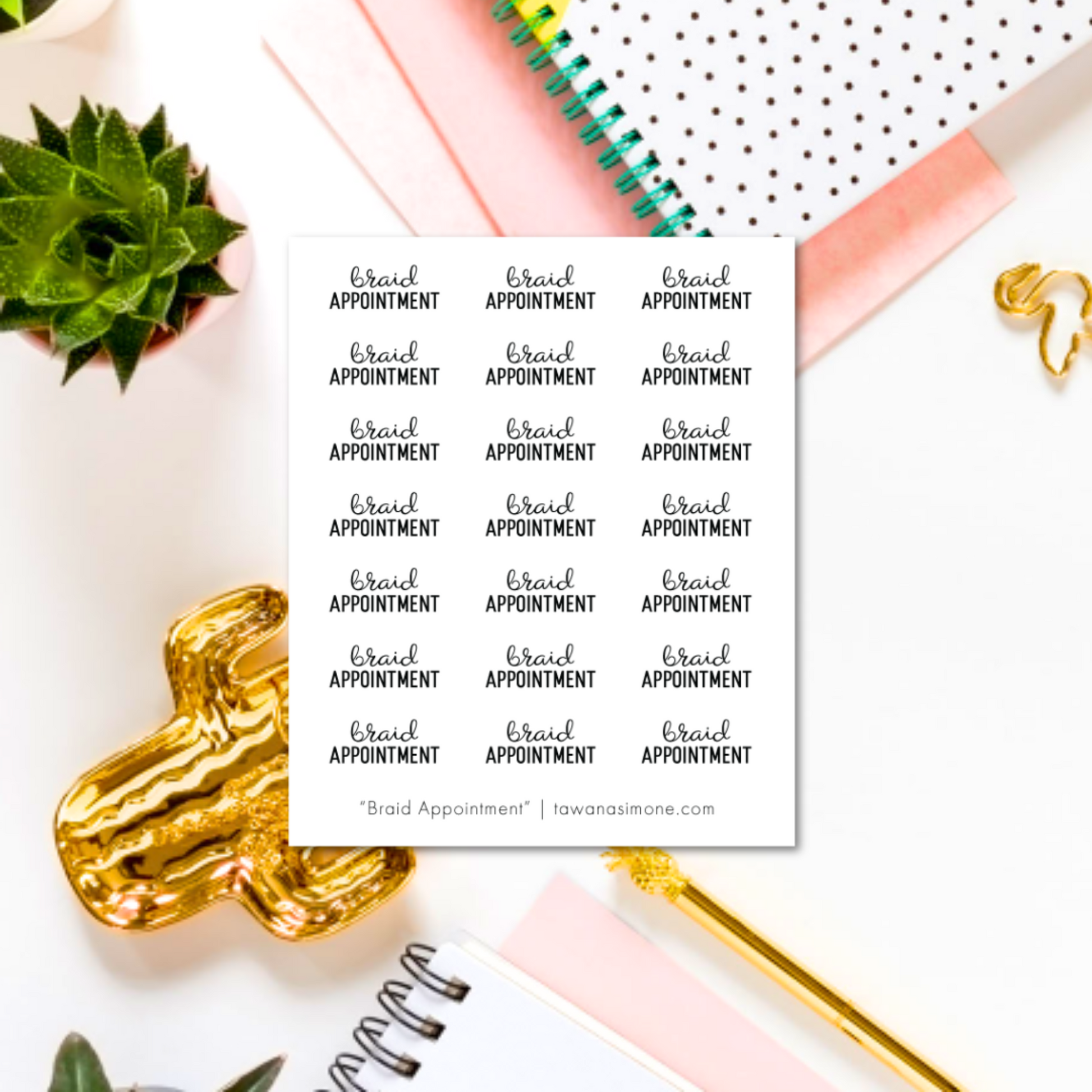Stay on track with your braid hair appointments in your planner, journal or notebook. Black sticker printed on standard white matte sticker paper.