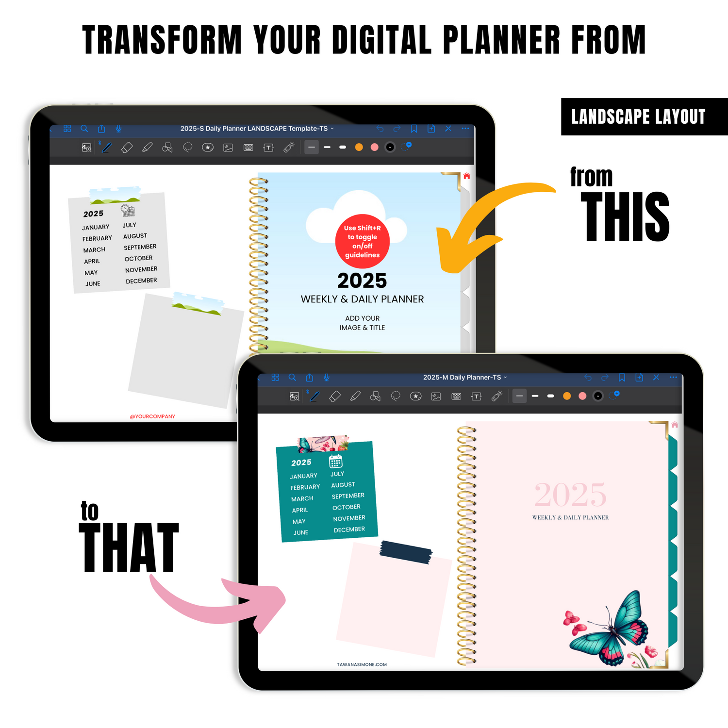 This 2025 daily life planner done for you template is a sleek design with customizable features that is available in portrait and landscape layouts. Major US holidays included. This template can be used digitally in your preferred writing app such as GoodNotes.