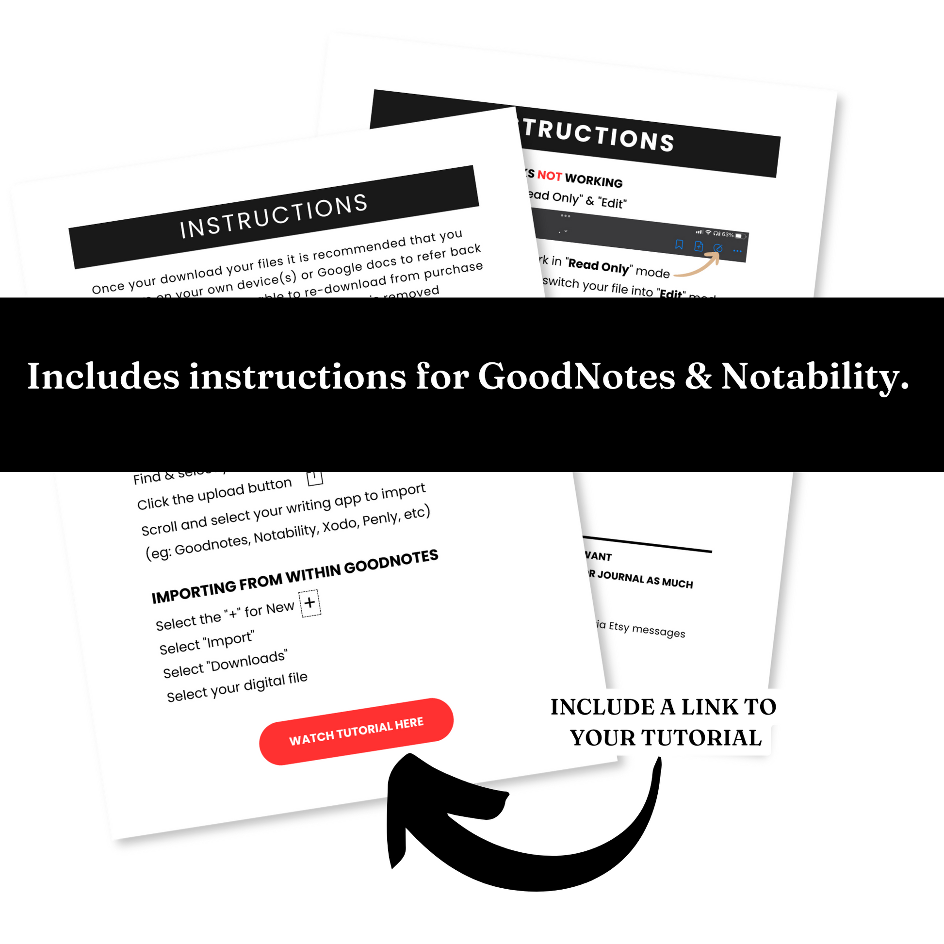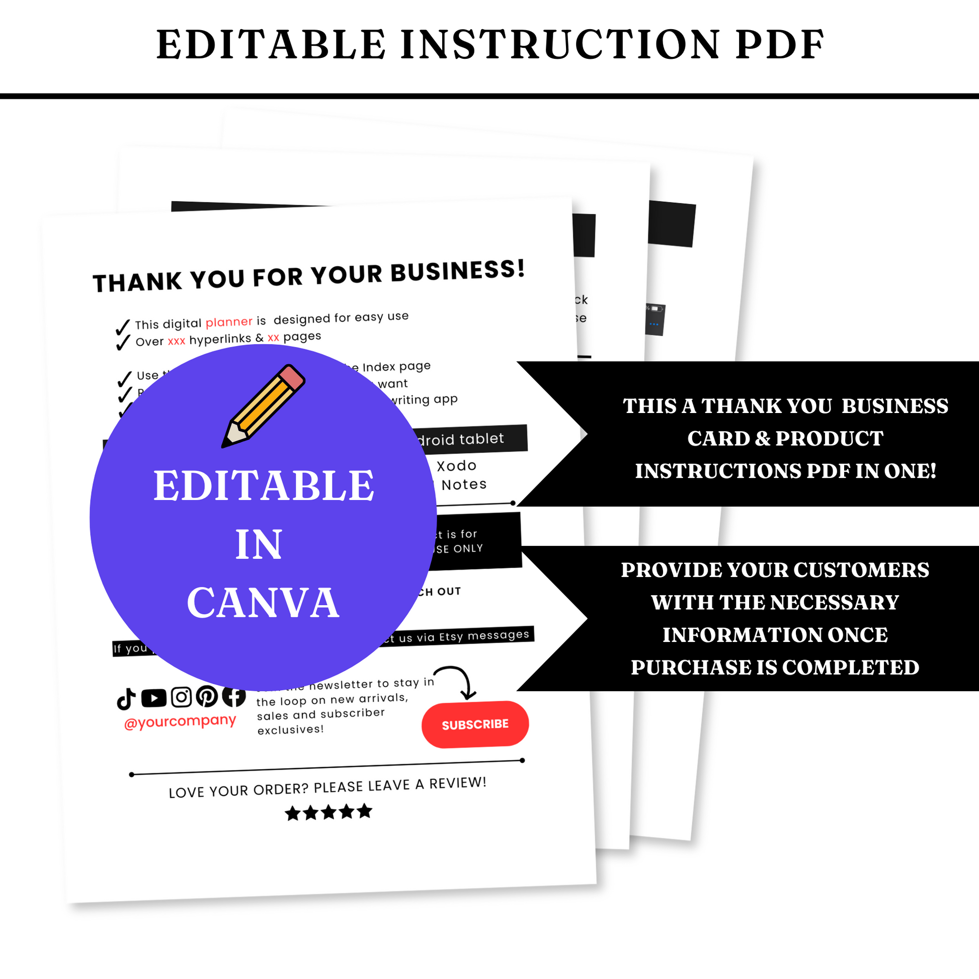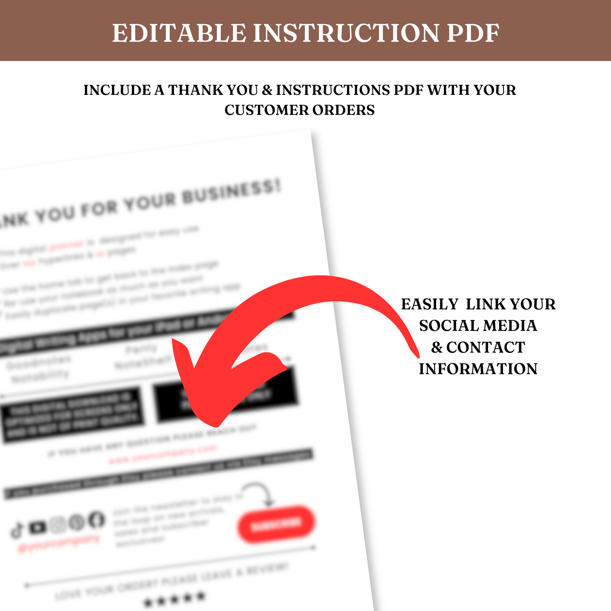 Don't forget to tell your customers thank you and offering them instructions to use your completed digital planner or journal. Easily edit this template to include your contact information and any tutorials to go along with your digital products.