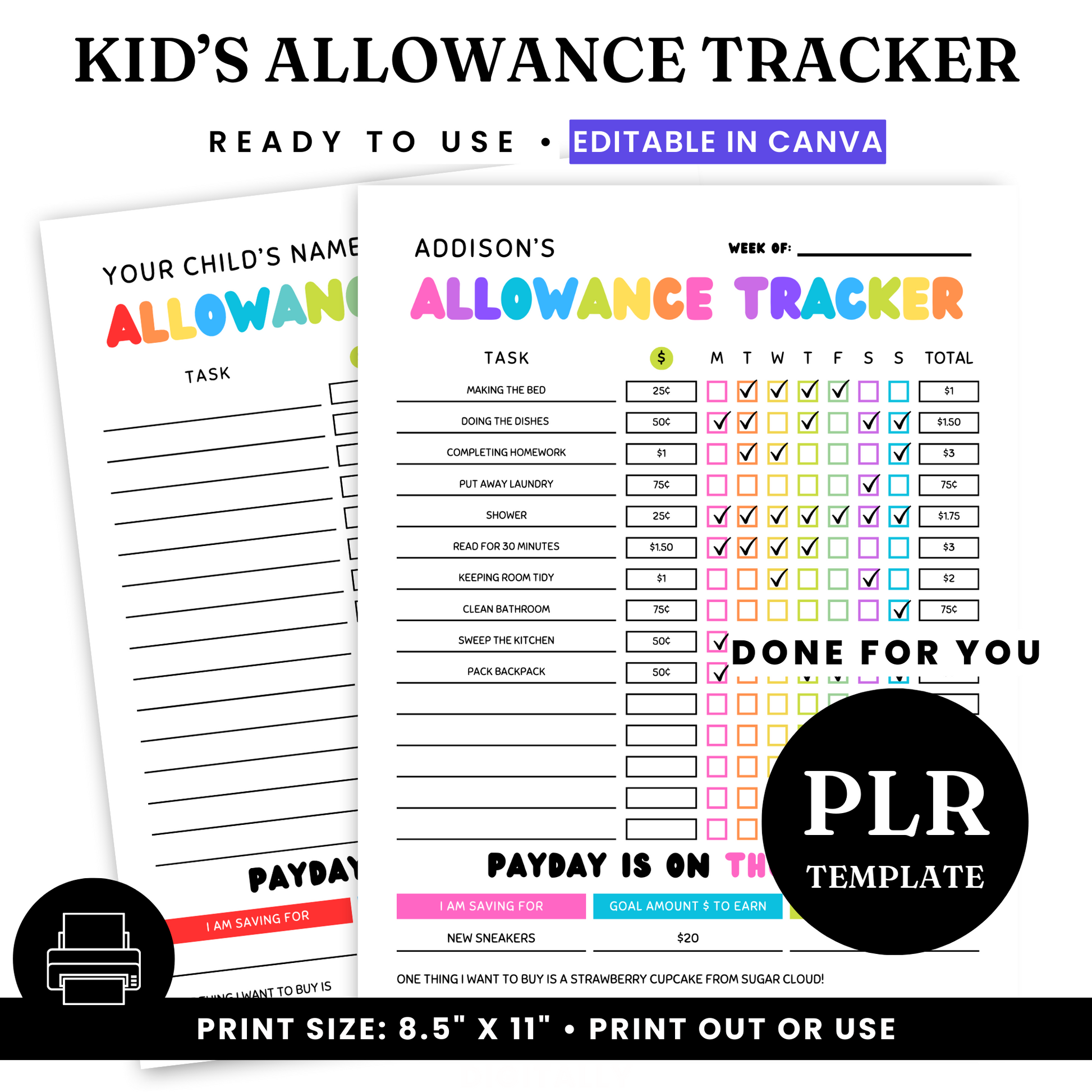 This done for you kids' allowance tracker is a great tool for individuals seeking to teach their child money management skills! This tracker is dedicated to assist with early child develop to teach kids how to earn and spend money. This done for you template is a sleek design with customizable features. This template can be used a printable or digitally in your preferred writing app such as GoodNotes.