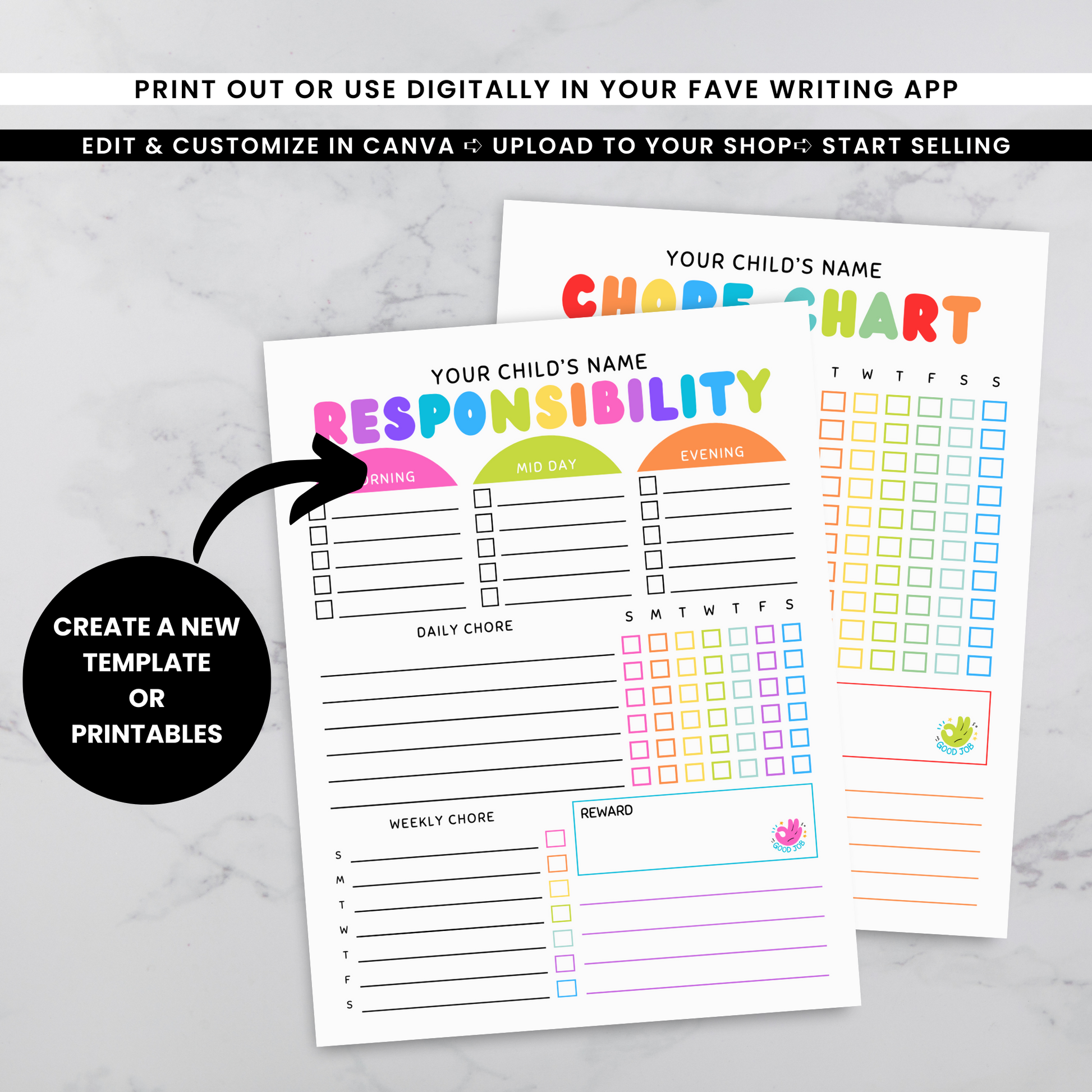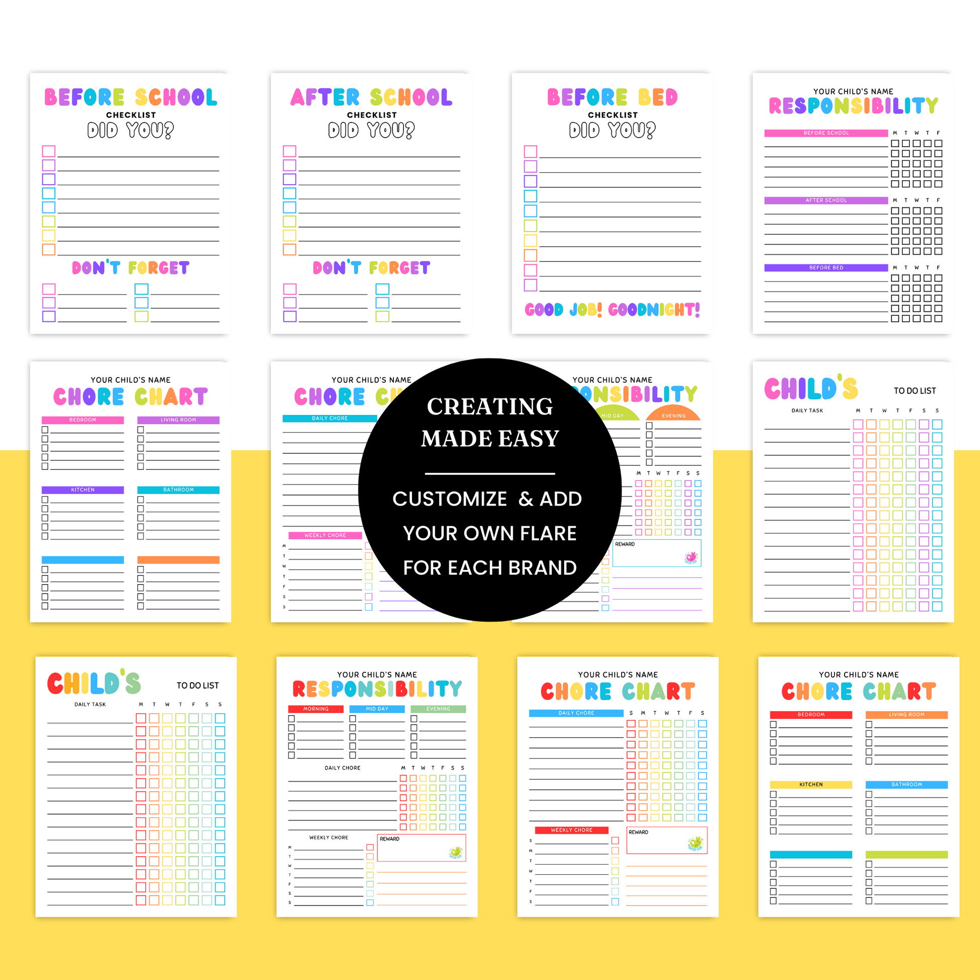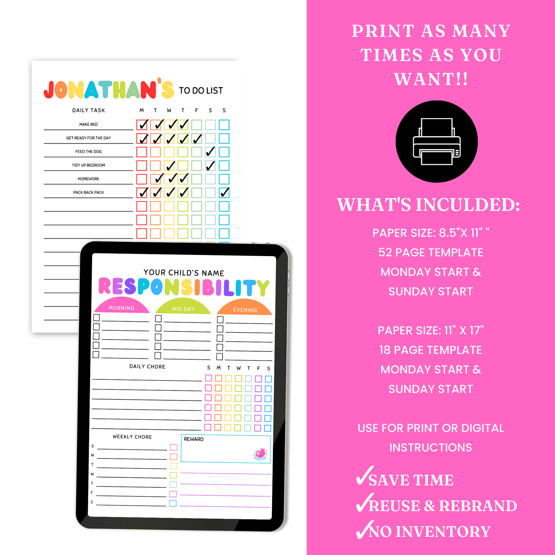 This done for you kids' chore chart the great tool for individuals seeking to keep track of their children's schedules and tasks! This chart is dedicated to assist with early child develop to teach kids to keep track of their responsibilities. This done for you template is a sleek design with customizable features. This template can be used a printable or digitally in your preferred writing app such as GoodNotes.