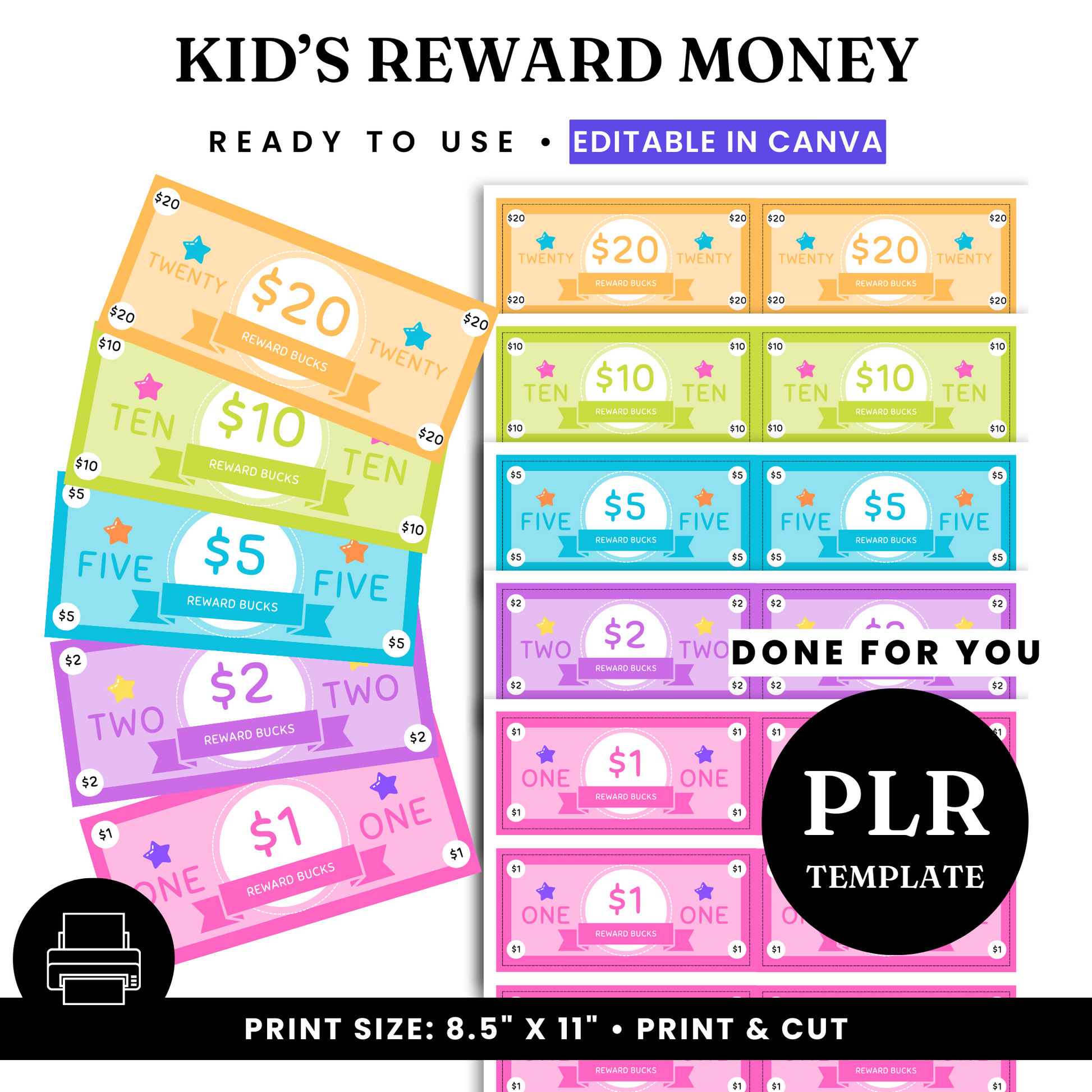 This done for you kids' reward money is a great tool for individuals seeking to teach their child money management skills! These pretend play money is dedicated to assist with early child develop to teach kids about how to manage money. This done for you template is a sleek design with customizable features. This template can be used a printable or digitally in your preferred writing app such as GoodNotes.