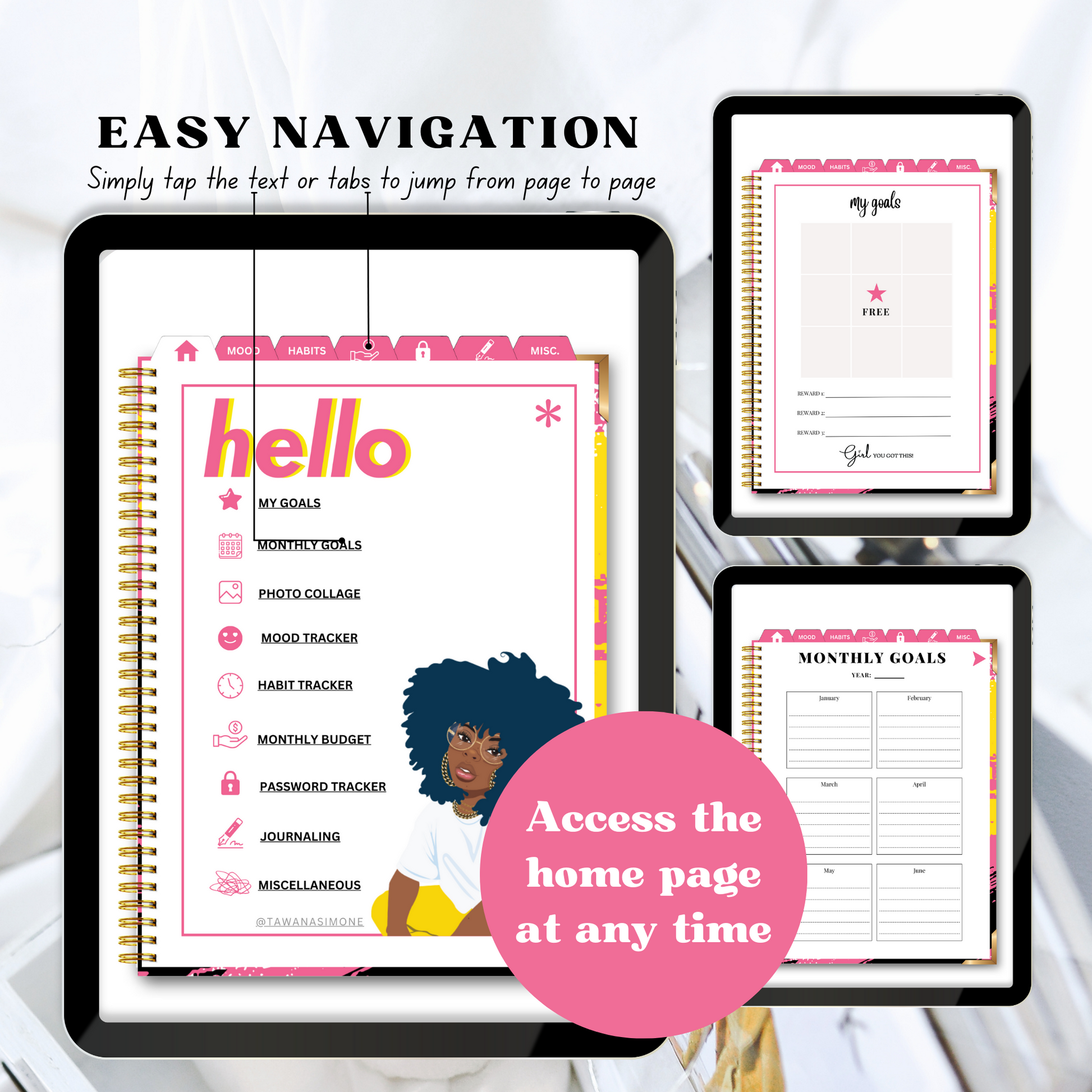Take control of your life with the digital journal. This hyperlinked journal lets you track your moods, habits, passwords and budget - all in one place! Plus, its beautiful cover design makes it easy to use as a diary, journal or daily/weekly planner. Get rid of the paper and pen and start tracking your life with digital journal on your iPad or tablet today!