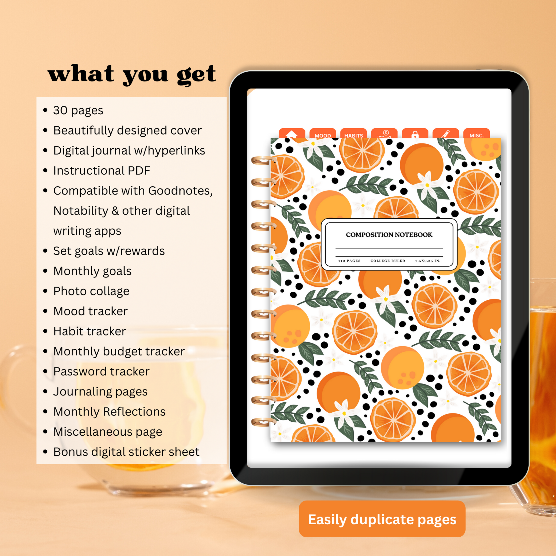 Take control of your life with the digital journal. This hyperlinked journal lets you track your moods, habits, passwords and budget - all in one place! Plus, its beautiful cover design makes it easy to use as a diary, journal or daily/weekly planner. Get rid of the paper and pen and start tracking your life with digital journal on your iPad or tablet today!